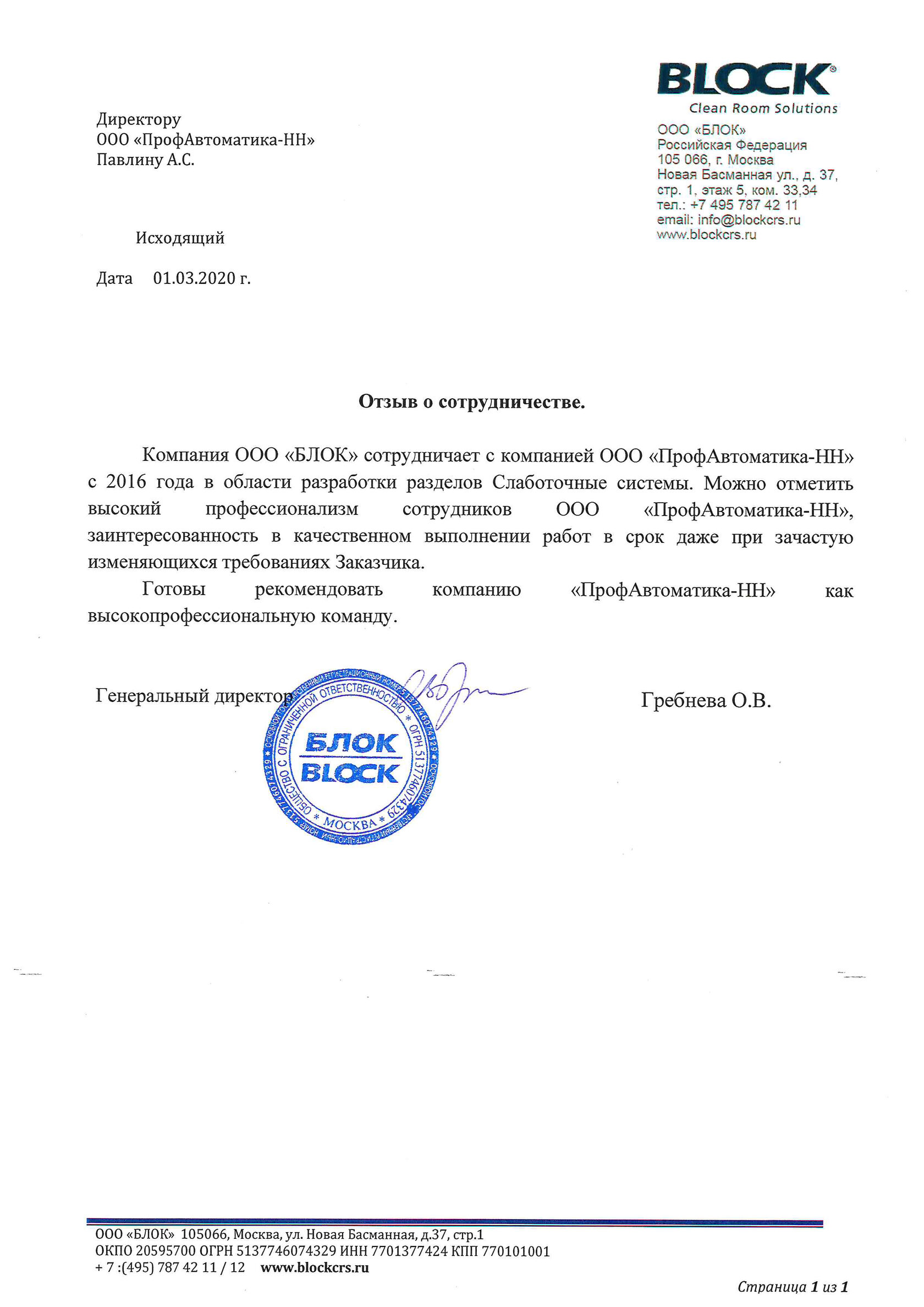 Компания ООО «БЛОК» сотрудничает с компанией ООО «ПрофАвтоматика-НН» с 2016 года в области разработки разделов Слаботочные системы. Можно отметить высокий профессионализм сотрудников ООО «ПрофАвтоматика-НН», заинтересованность в качественном выполнении работ в срок даже при зачастую изменяющихся требований Заказчика. Готовы рекомендовать компанию «ПрофАвтоматика-НН» как высокопрофессиональную команду.