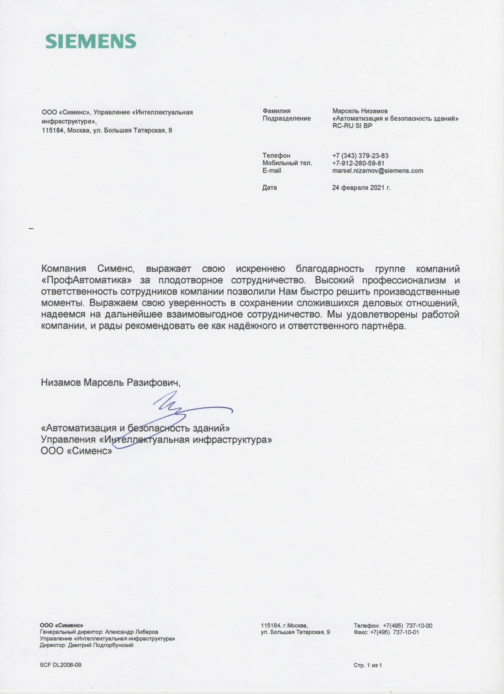 Компания «Сименс», выражает свою искреннею благодарность группе компаний «ПрофАвтоматика» за плодотворное сотрудничество. Высокий профессионализм и ответственность сотрудников компании позволили Нам быстро решить производственные моменты. Выражаем свою уверенность в сохранении сложившихся деловых отношений, надеемся на дальнейшее взаимовыгодное сотрудничество. Мы удовлетворены работой компании, и рады рекомендовать ее как надёжного и ответственного партнёра.